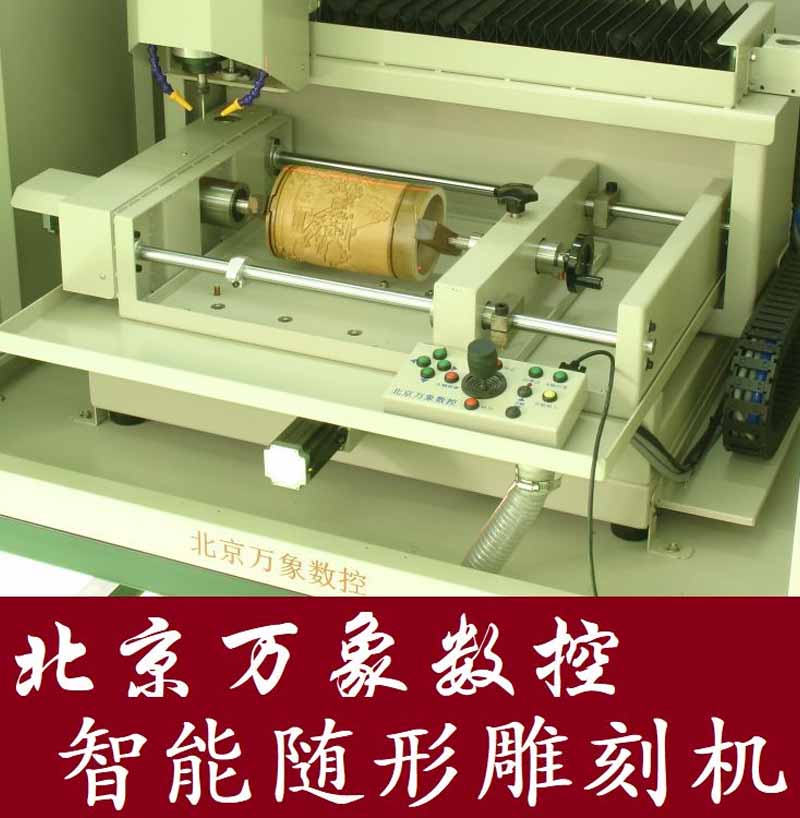 北京万象数控智能随形雕刻机,在处理竹筒、陶瓷,角骨类等曲面材料,雕刻机自带3D激光轮廓扫描仪先检测原材料整周表面轮廓,得到材料轮廓特征,可任意设置图形大小、深浅,附图自动套合轮廓,动态实时查看套合效果,自动定位加工。